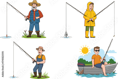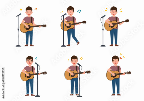 Camping vector. Happy male friends rest at bonfire illustration isolated on white background. Guys playing guitar and frying marshmallow at campfire. Outdoors traveling activity, picnic on nature