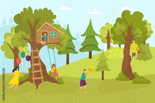 Camping vector illustration. Happy touristic family rest on nature. Woman cooking food on bonfire, man fishing in river, parent and kid playing guitar and singing at campfire illustration