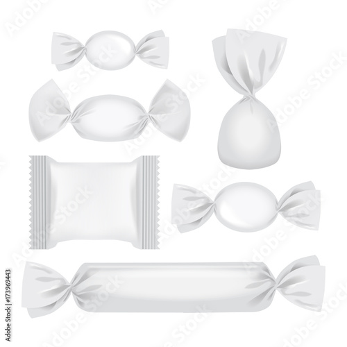 Candy packaging mockup set, vector isolated illustration. Realistic white and transparent blank plastic foil food snack pack for candy, chocolate bar etc.