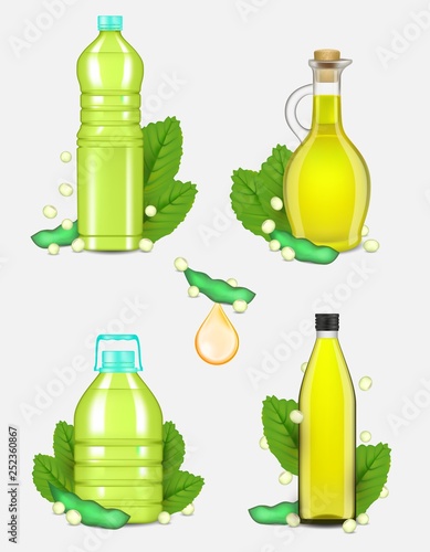 Cannabis oil set. Vector realistic illustration of plastic and glass bottles of hemp oil with cannabis plant leaves.