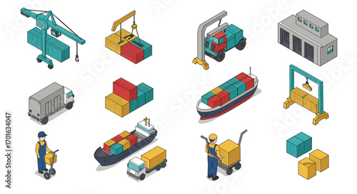 Car accident isometric vector set of icons. Injured people character, insurance agent, paramedics providing first aid and evacuator transportation, police, ambulance, crashed vehicle