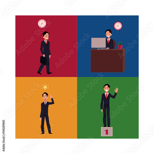 Vector illustration of young male parking assistance or parking attendant standing inside of guard booth. Car guard concept design element in flat style.
