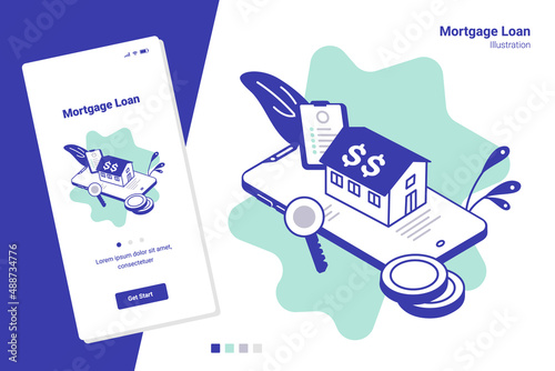 Car insurance online, vector illustration. Smartphone with auto insurance policy, shield, car damaged by fallen tree, finger tapping buy button. Isometric composition for poster, banner, website page.