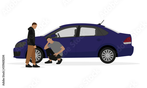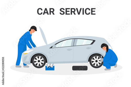 Auto mechanics fixing broken car, vector illustration. Car repair workshop, tire service concept for web banner, website page etc.