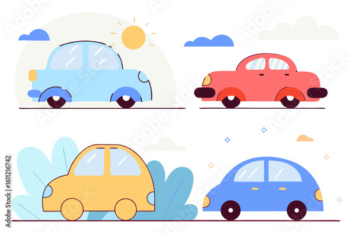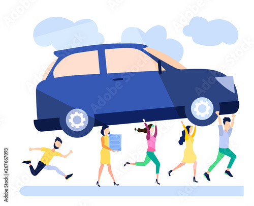 Car service and repair vector concept illustration. Mechanics fixing or replacing broken car door and tire. Auto dody repair shop concept for web banner, website page etc.
