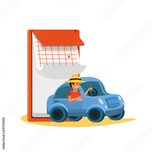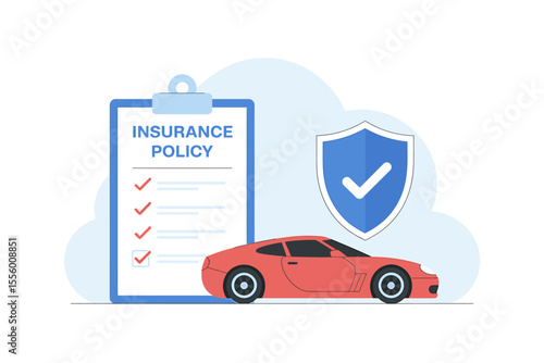 Huge car rental agreement, red auto and micro male and female characters with passport, key and pen, vector illustration. Car rent, automobile leasing concept for web banner, website page etc.