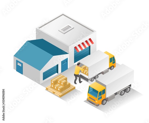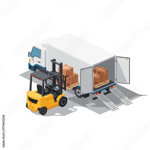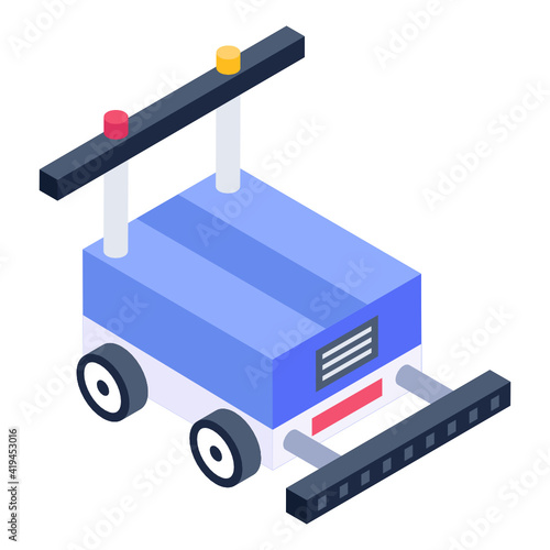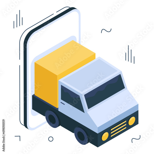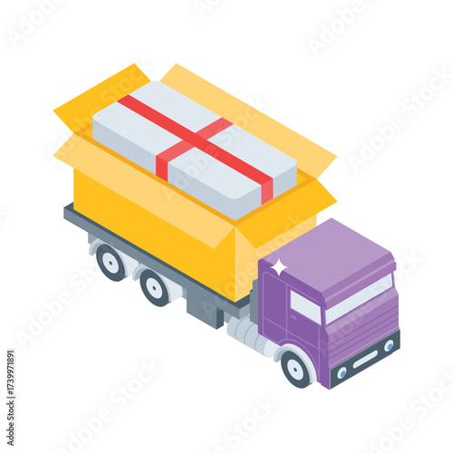 Car road accident and truck assistance emergency service vector icon. Isometric tow truck evacuator lifting crashed auto with crane illustration isolated on white background