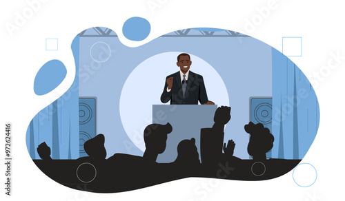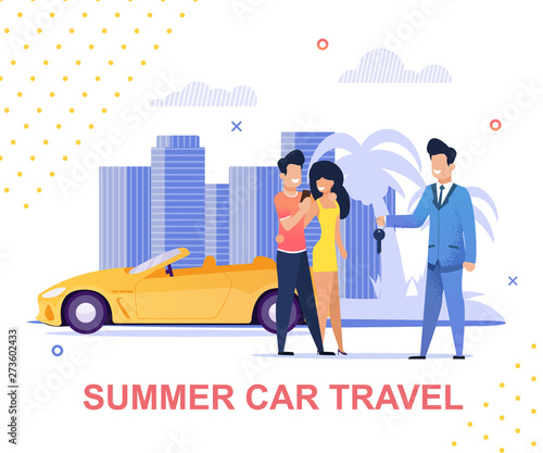 Car showroom with new car and two male characters auto dealer and buyer, flat vector illustration. Salesman giving keys to happy man automobile owner. Sale, buy or car rental, auto dealers services.