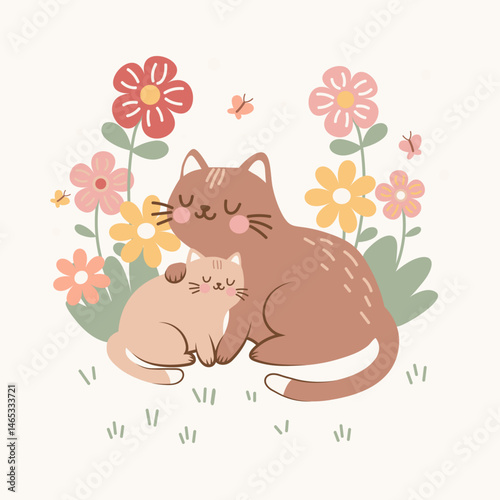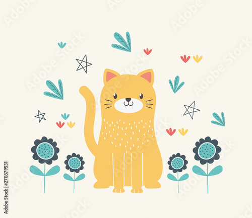 Cartoon cat vector. Cute animal icon for card design. Kitten character watering spring flower with can isolated illustration on white background