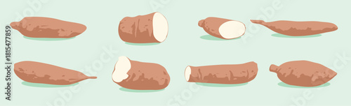 Cartoon chicken fresh raw meat vector set. Variety of uncooked poultry organic food for barbecue illustration. Whole hen, fillet, wings, sausages, eggs, drumstick isolated on white background
