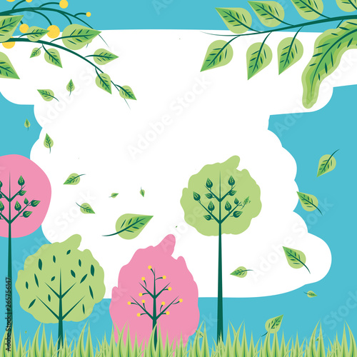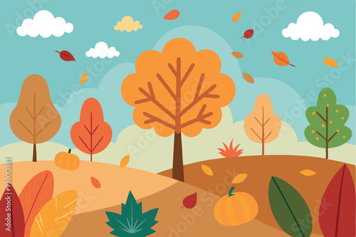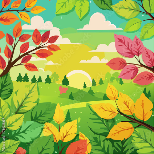 Cartoon garden field flat vector nature background. Meadow with green grass and yellow trees autumn scene. Scenic valley panorama. Gardening and ecology concept