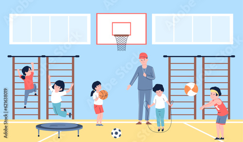 Cartoon children at school sport gym vector illustration. Sportive activity leisure games indoors. Teacher training with kids, boys and girls doing physical exercises, kicking ball, jumping on rope