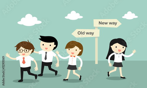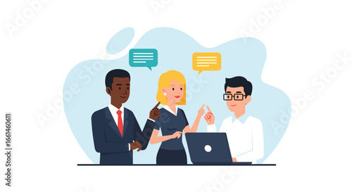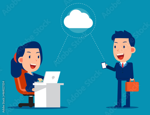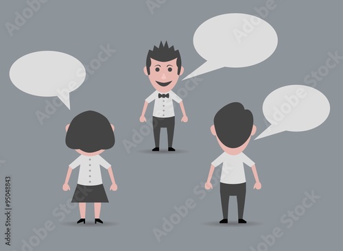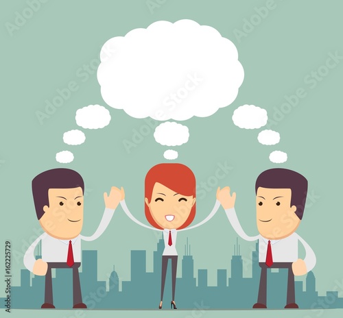 Cartoon office worker loves his work outstanding from crowd. Going to work vector concept illustration in flat style design. Man characters, clouds, message bubble, heart, going to work.