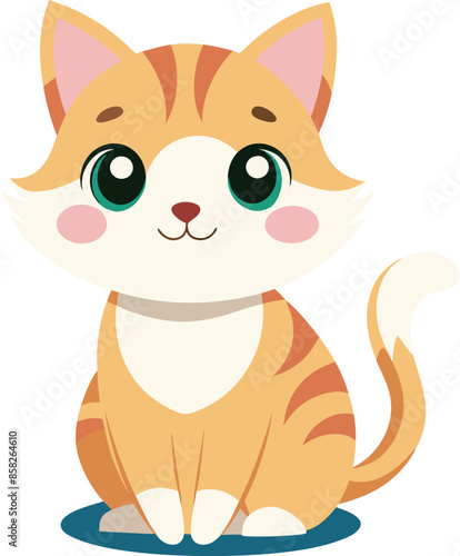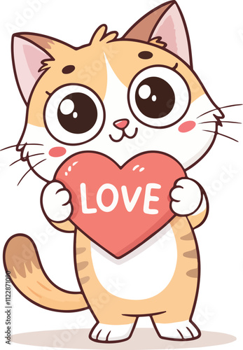 Cat in love. Cute vector animal. Funny cartoon adorable pet character icon illustration for greeting invitation card design. Kawaii valentine kitten jumping with heart in paw isolated on white