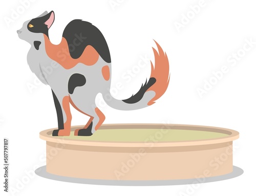 Cat pooping into litter box toilet with sand vector icon. Pet tray for feline feces excrement and urine. Funny cute domestic animal sitting in hygienic litterbox illustration