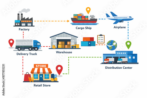 Cattle farming, beef meat production infographic, flat vector illustration. Meat factory processing line. Distribution, sale, consumption. Food industry.