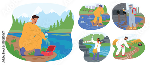 Stone age set. Vector flat illustration of cavemen primitive prehistoric people hunting, cooking meat on open fire, gathering brushwood, making hunter tools stone spears.