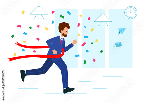 Happy young man running with balloons, vector flat illustration isolated on white background. Happy birthday anniversary corporate party or other event celebration.