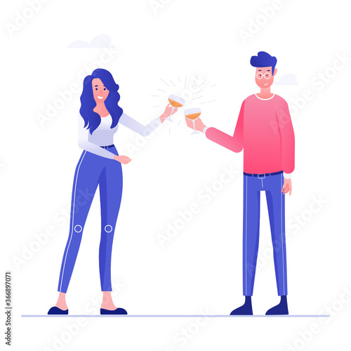 Two women toasting each other while clinking champagne glasses, vector flat illustration isolated on white background. Happy birthday anniversary corporate party or other event celebration.