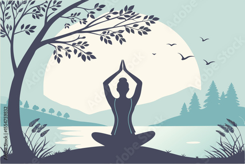 Character relax in zen vector. Male yogi exercise for peaceful of mind and balance, spiritual tranquil training. Meditation, brain calm and stress relieve poster