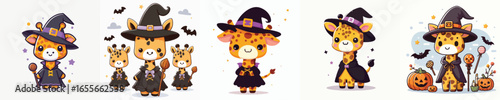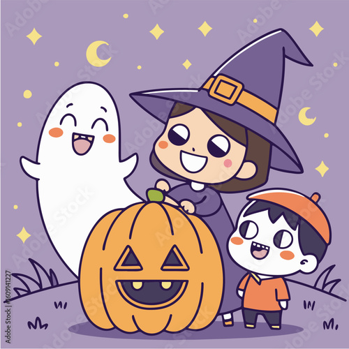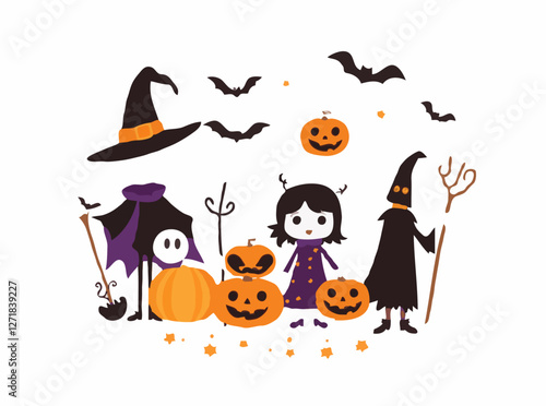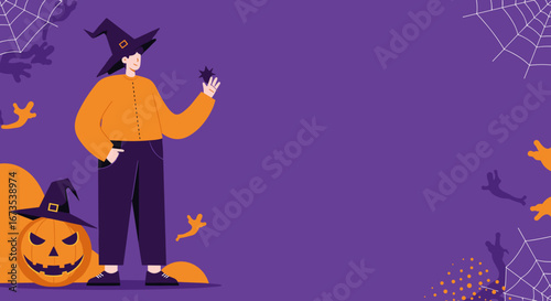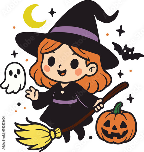 Charmed little witch girl child cartoon Halloween character vector illustration. Small sorceress holding carved pumpkin jack-o-lantern tradition autumn symbol