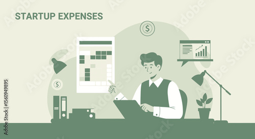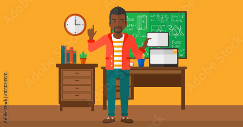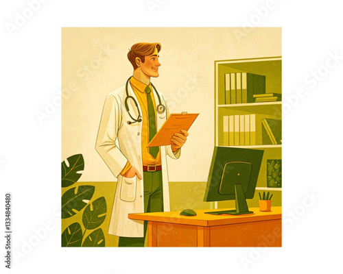 Vector illustration of chemist male holding test tube rack. Laboratory interior with lab glassware. Chemist concept flat style design element.
