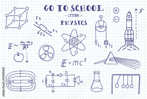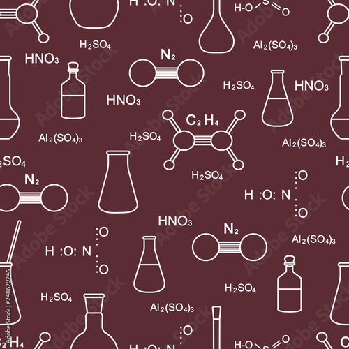 Chemistry formulas and flasks on white background. Seamless pattern. Vector illustration.