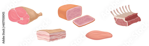 Vector illustration of fresh whole chicken, breast halves fillets, wings and chicken drumsticks in tray packing isolated on white background. Realistic mockup of hen meat sales plastic packaging set.
