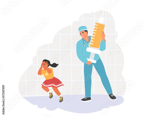Child fears vector. Little girl running away from doctor scared of big syringe and needle for injection illustration. Children phobia and expression