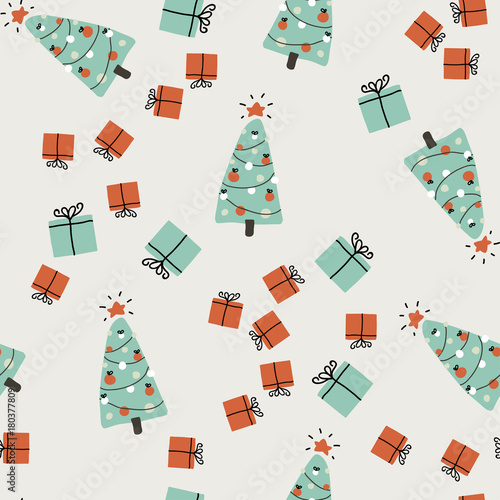 Christmas and new year season greeting card and background template. Winter holiday vector illustration. 2021 new year hand drawn poster. Christmas tree and toys, people, city buildings, snowman.