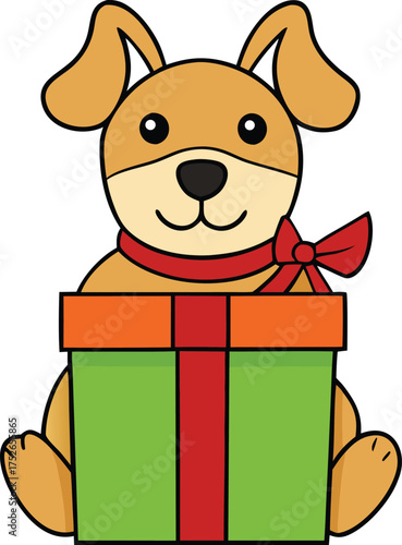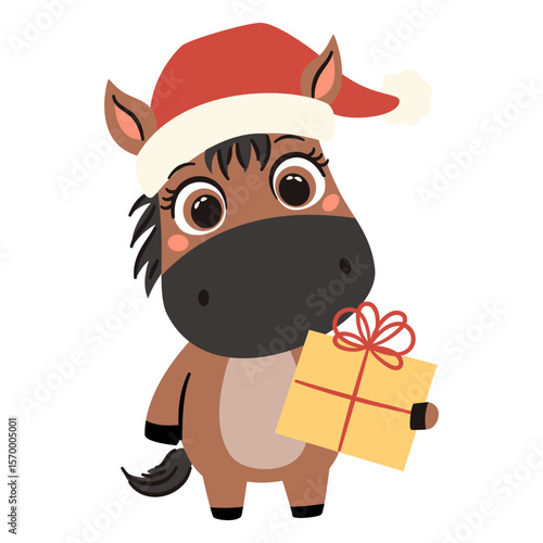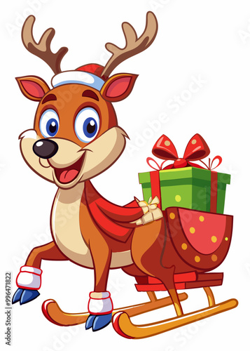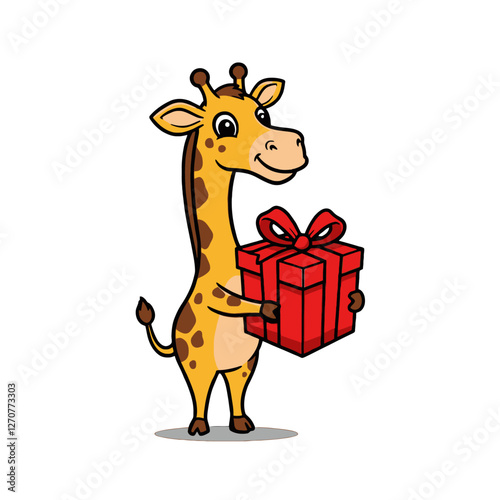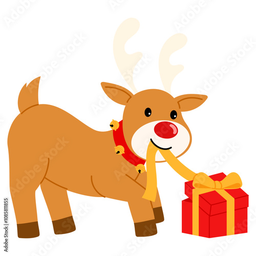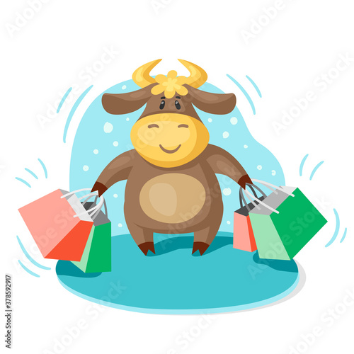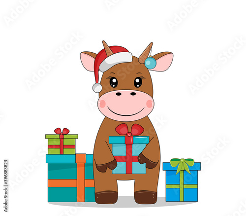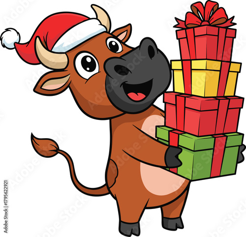 Christmas cow character wearing warm scarf and lots of gift box vector icon isolated on white background.