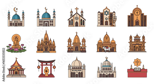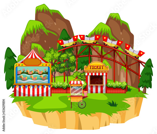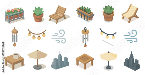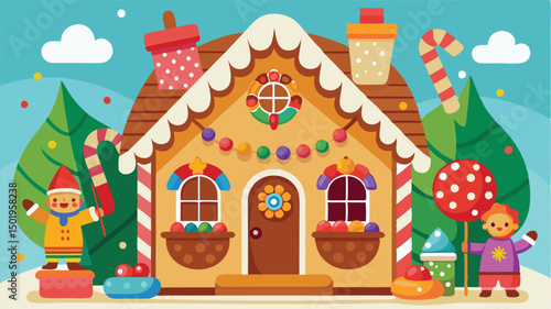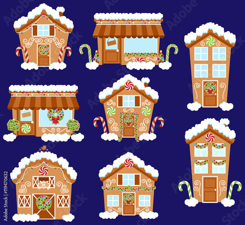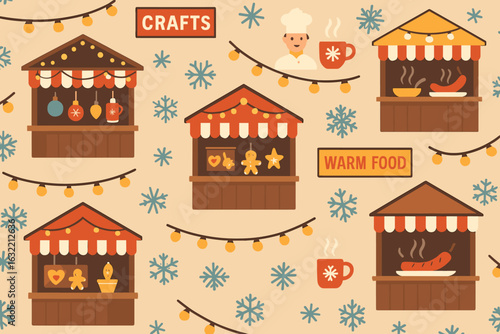 Christmas fair set, flat vector illustration. Winter street market stalls with mulled wine, grilled food, christmas gifts, gingerbread biscuits. People ice skating, visiting New Year fair, having fun.