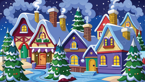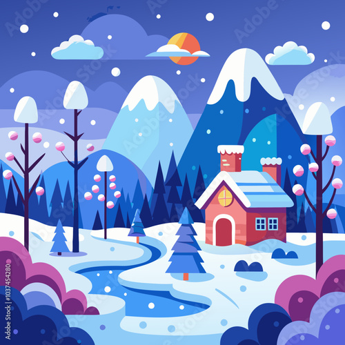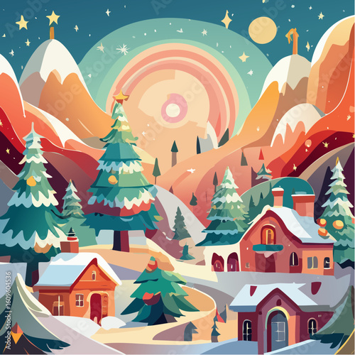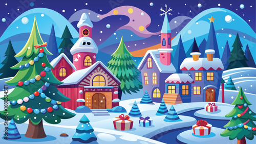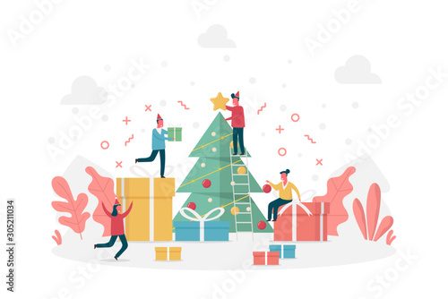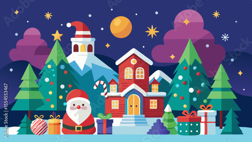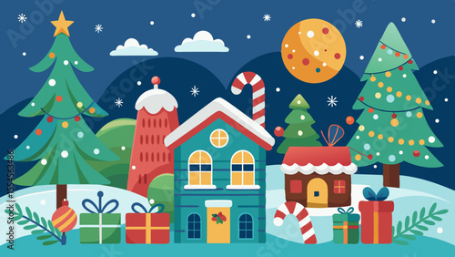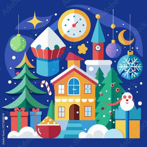Christmas gifts, vector illustration in paper art style. Open magic box with xmas decoration explosion, winter night forest landscape with snowy trees and gift boxes.