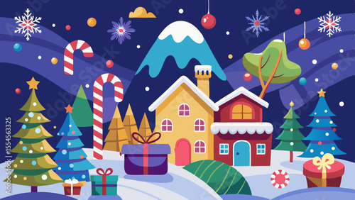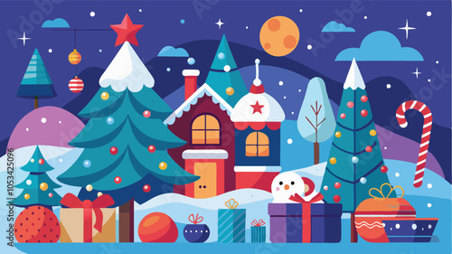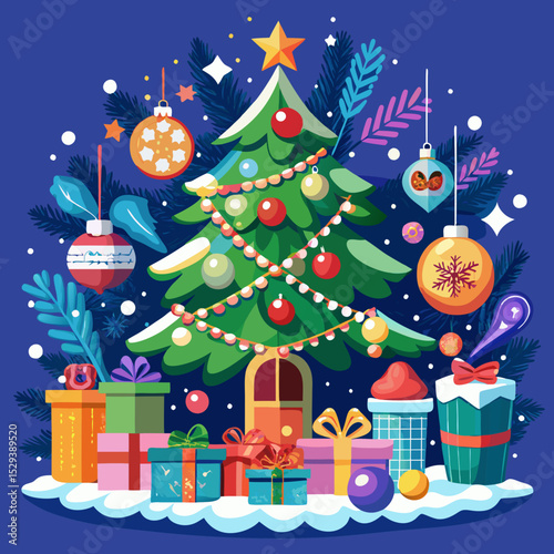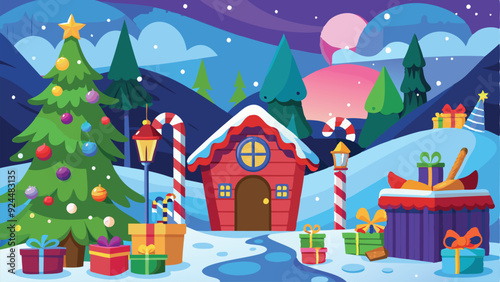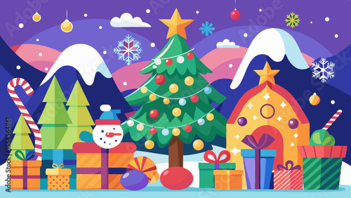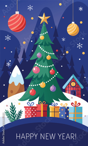 Christmas gifts, vector illustration in paper art style. Open magic box with xmas decoration explosion, winter night forest landscape with snowy trees and gift boxes.