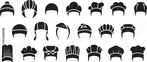 Christmas hats and decorations, flat vector isolated illustration. Santa Claus hats, funny elf ears, deer horns, carnival headbands. Christmas costume set.