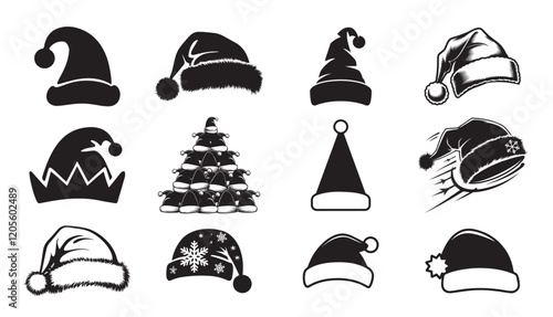 Christmas hats and decorations, flat vector isolated illustration. Santa Claus hats, funny elf ears, deer horns, carnival headbands. Christmas costume set.