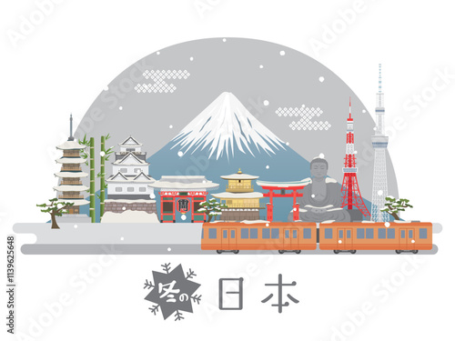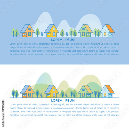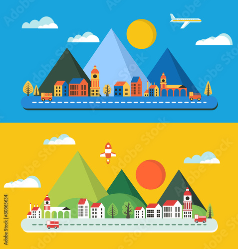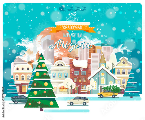 Christmas holiday season. Small town in snowfall. City and mountain landscape background. Vector illustration in flat style design. Cards and banners for Christmas celebration