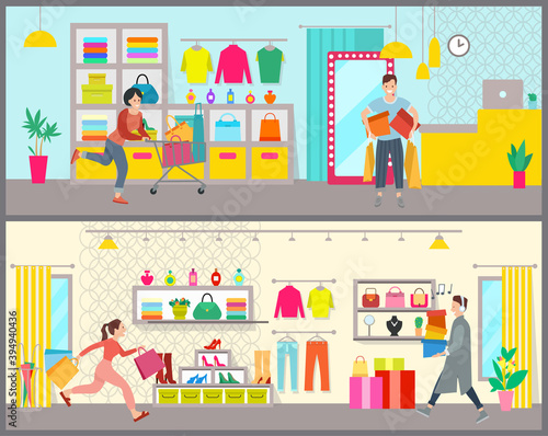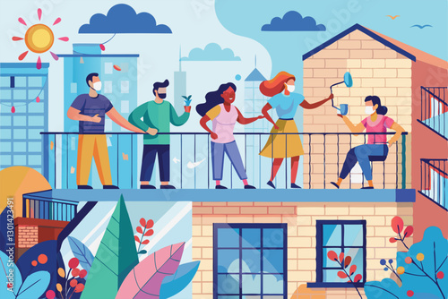 Christmas neighbors vector. Happy people neighbors in home building window congratulating and greeting each other. Quarantine on holidays, social distancing, stay home concept