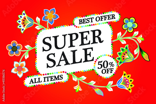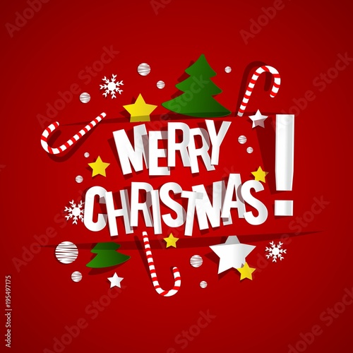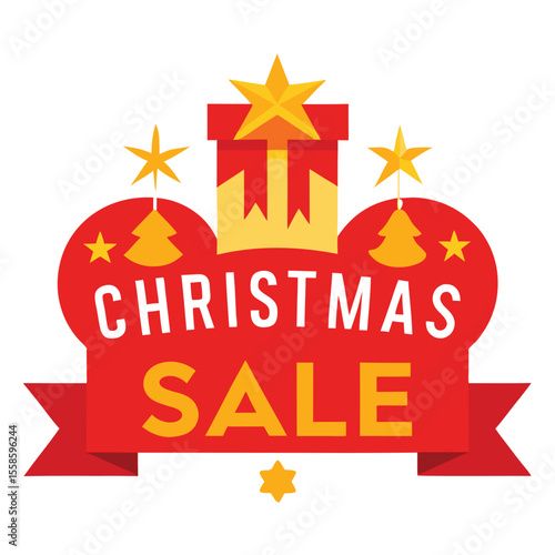 Christmas sale poster template, vector illustration in paper art modern craft style. 50 percent discount promotion red website banner with christmas tree branches, angels, gift boxes.