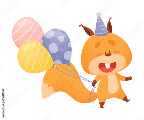 Christmas card cute animal vector icon. Squirrel running with ornament ball xmas tree decoration. Happy winter holiday invitation postcard design. Isolated on white background