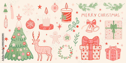 Christmas tree with Christmas and New Year icon set. Vector decorative holiday symbols reindeer, gift, snowman, bells, champagne. Thin line flat style design illustration isolated on white background.