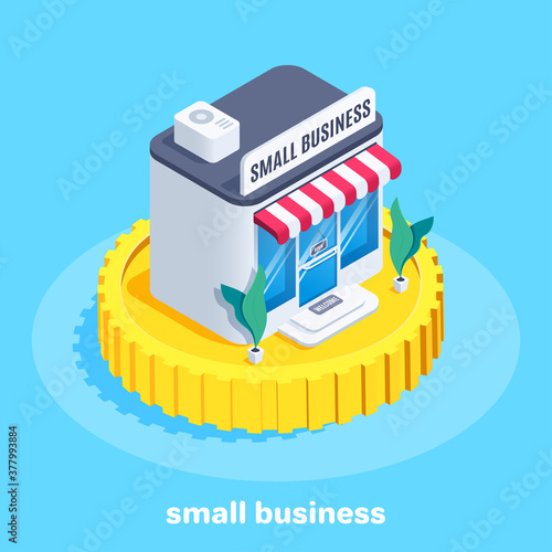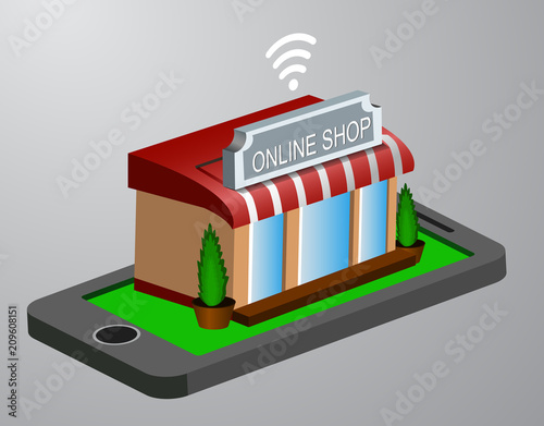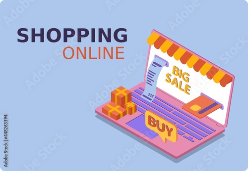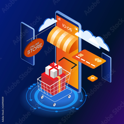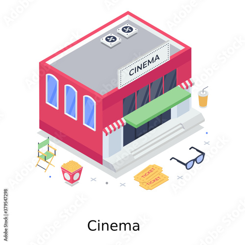 Booking cinema tickets online concept vector isometric illustration. Movie theater symbols clapperboard, popcorn, 3D glasses, soda, tickets, buy now button placed on smartphone screen.