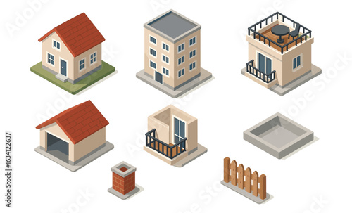 City apartment building set, vector isolated illustration. Isometric multi storey residential house exterior, front view, home facade.