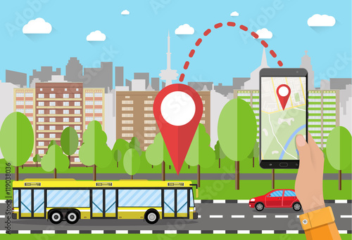City landscape with road and park concept vector banners. Bus stop and car on a street. Vector illustration in flat style design.