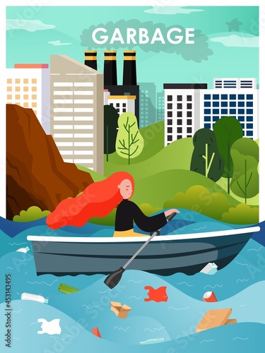 City polluted with industrial factory smoke. Woman boating on the river full of garbage, flat vector illustration. Stop water and air pollution. Ecological problem. Save environment poster template.