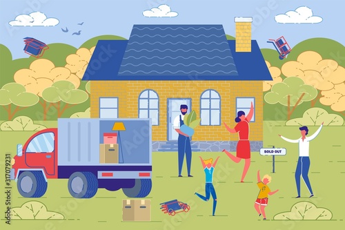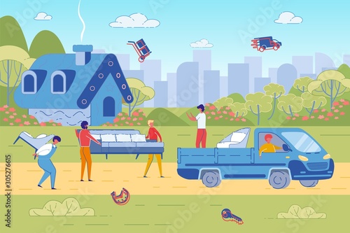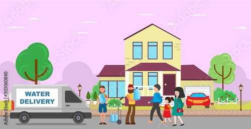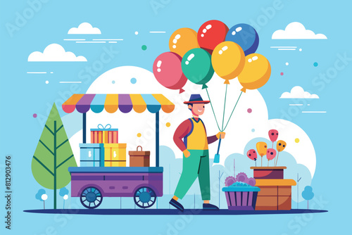 City public park concept vector illustration. Icecream salesman selling ice cream cones, kids playing ball, woman walking dog, street sweeper with broom. Flat style design.