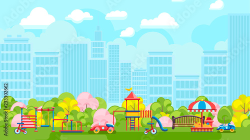 City street concept vector illustration in flat style. Street food cart or tricycle coffee bike, sports ramp and people buying coffee to go, riding bicycle and skateboard. Flat style design.