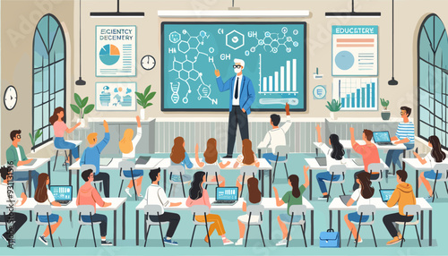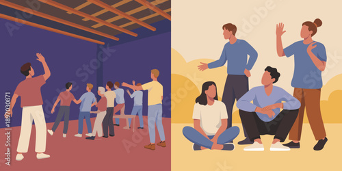 City street with coffee shop, cafe, grocery store buildings and people walking with dogs, sitting at table, shopping, flat vector illustration. Urban street architecture.