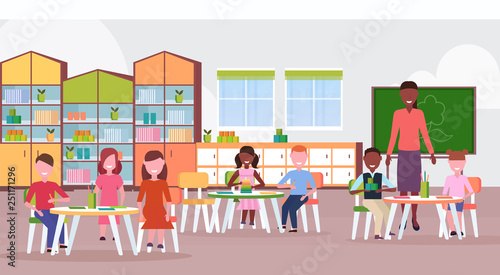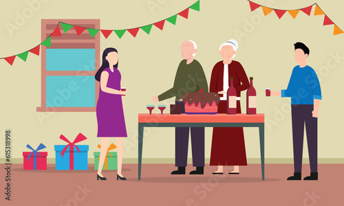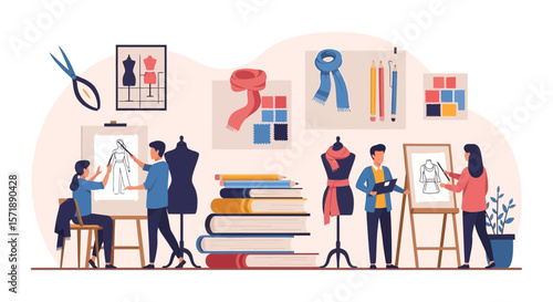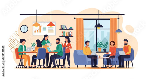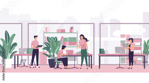City street with apartment buildings and stores, sidewalk cafe, bakery, coffee shop, spa salon with visitors, shoppers, flat vector illustration. People walking down city shopping street.