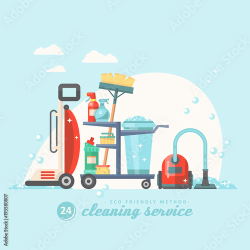 Cleaning company services vector flat illustration. Vacuum cleaner, caution wet floor sign, car, bucket, sponge mop. Floor cleaning equipment concept for web banner, website page etc.